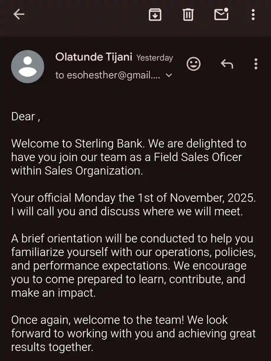 Some recently onboarded Nigeria Jubilee Fellows Programme (NJFP) fellows assigned to Sterling Bank as their host organization have received emails welcoming them as Field Sales Officers within the Sales Organization.