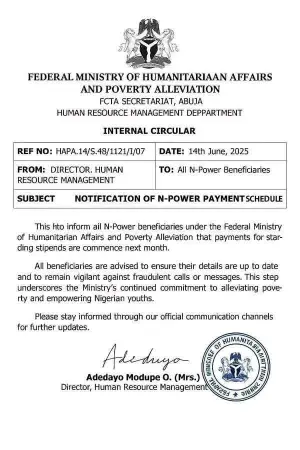 Attached below is a copy of the fake circular falsely claiming a “notification of N-Power payment schedule”.