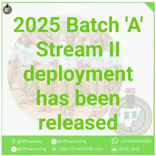 The National Youth Service Corps (NYSC) has released the 2025 Batch ‘A’ Stream II deployment list. All Prospective Corps Members (PCMs) are advised to log in to the NYSC portal to print their Call-Up Letters and the Addendum, which must be signed and submitted at the Orientation Camp during registration.