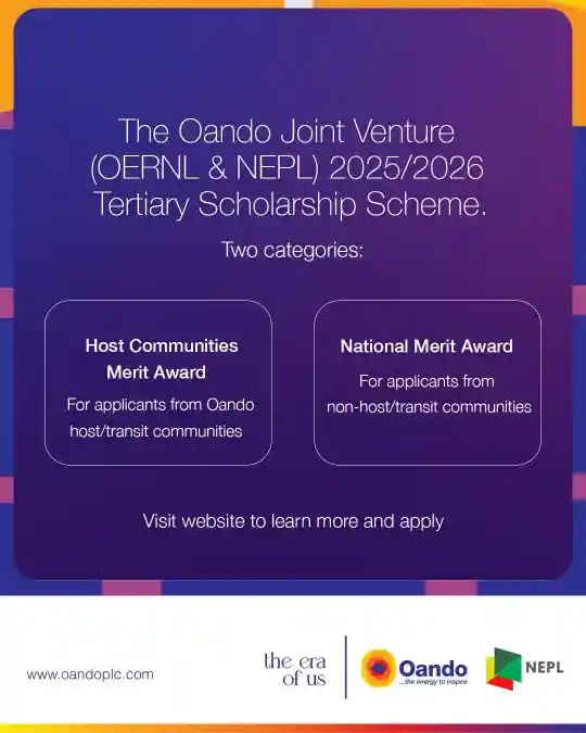 The Oando Joint Venture (JV) 2025/2026 Tertiary Scholarship Scheme is now open for applications. This scholarship is part of a long-standing commitment by the NNPC Exploration and Production Limited (NEPL) and Oando Energy Resources Nigeria Limited (OERNL) to support education through their Corporate Social Responsibility (CSR) efforts. The goal is to help undergraduates across Nigeria, especially in oil-producing communities, pursue their academic dreams and develop into future leaders.