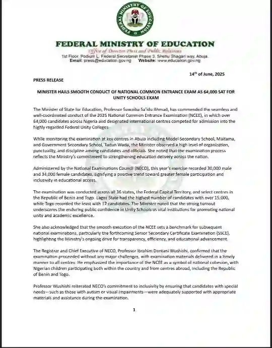 June 14, 2025 – The Minister of State for Education, Professor Suwaiba Sa’idu Ahmad, has praised the successful organisation of the 2025 National Common Entrance Examination (NCEE), which recorded over 64,000 candidates across Nigeria and select international centres. The examination was held for students seeking admission into Federal Unity Colleges.