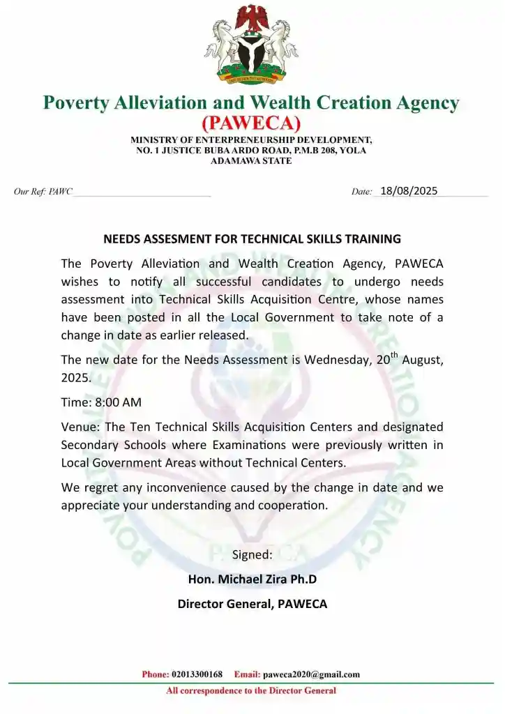August 18, 2025 – The Poverty Alleviation and Wealth Creation Agency, PAWECA, under the Ministry of Entrepreneurship Development, Yola, Adamawa State, has announced a shift in the scheduled needs assessment for candidates into the Technical Skills Acquisition Centre.