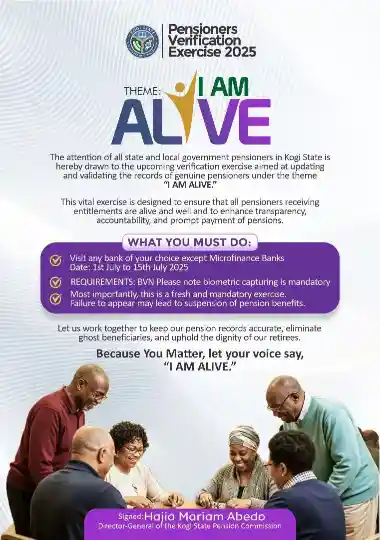 The Kogi State Pension Commission has announced the commencement of the 2025 Pensioners Verification Exercise under the theme “I AM ALIVE.” The exercise is set to begin on 1st July 2025 and will run till 15th July 2025, covering all state and local government pensioners.