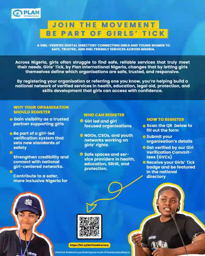 In a message to stakeholders, Plan International Nigeria said, “Girls deserve access to safe, trusted, and girl-friendly spaces. Plan International Nigeria is building Girls’ Tick, a girl verified digital directory that connects adolescent girls and young women to organisations they can trust.” The organisation also encouraged groups working in key sectors to participate, noting, “If your organisation supports girls in areas such as health, education, skills development, legal aid, or protection, we want you on board.”