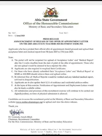 June 5, 2025 – The Abia State Government, through the Office of the Honourable Commissioner, Ministry of Basic and Secondary Education, has announced that successful candidates in the 2025 teachers recruitment exercise must upload their acceptance letter and medical report from June 5 to June 17, 2025.