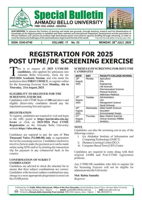 According to the statement signed by the Registrar, Mal. Rabiu Samaila, “All 2025 UTME/DE candidates who applied for admission into Ahmadu Bello University, Zaria for the 2025/2026 Academic Session, and who made the institution their first choice, are requested to register online for the screening exercise from Monday, 4th to Thursday, 21st August, 2025.”