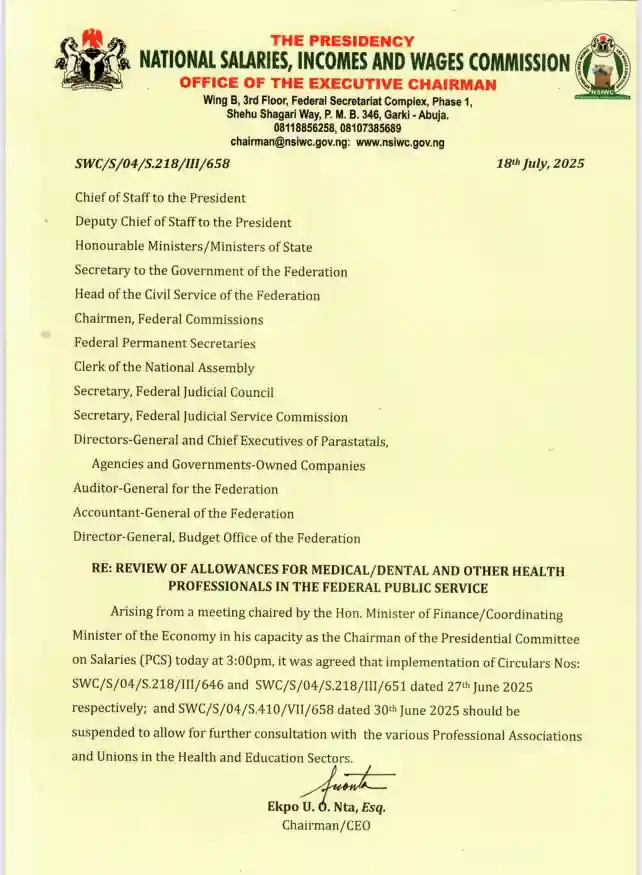 The National Salaries, Incomes and Wages Commission (NSIWC), under the Presidency, has announced a temporary suspension on the implementation of recent circulars regarding reviewed allowances for medical, dental, and other health professionals working in the Federal Public Service.
