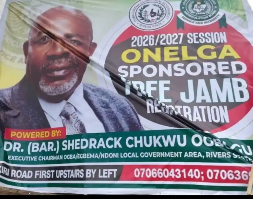 In recognition of education as a vital tool for youth development and societal growth, the Chairman of Ogba/Egbema/Ndoni Local Government Area, Hon. Shedrack Chukwu Ogbogu, Rivers State, has launched a programme to support parents and students with free registration for the 2026/2027 Joint Admissions and Matriculation Board (JAMB) examination, which is currently ongoing nationwide.