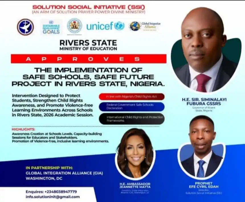 The Rivers State Government, through the Ministry of Education, has launched the Safe Schools, Safe Future Project, an initiative aimed at strengthening children’s rights and promoting violence-free learning environments across schools in the state.