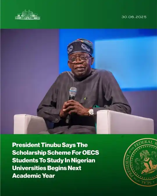 President Bola Ahmed Tinubu has officially announced that the new scholarship scheme for students from the Organisation of Eastern Caribbean States (OECS) to study in Nigerian universities will begin in the upcoming academic year. The President made this known during a joint press conference held with the Prime Minister of Saint Lucia, Philip J. Pierre, in Gros Islet on Monday, after a high-level working luncheon with leaders from the OECS.