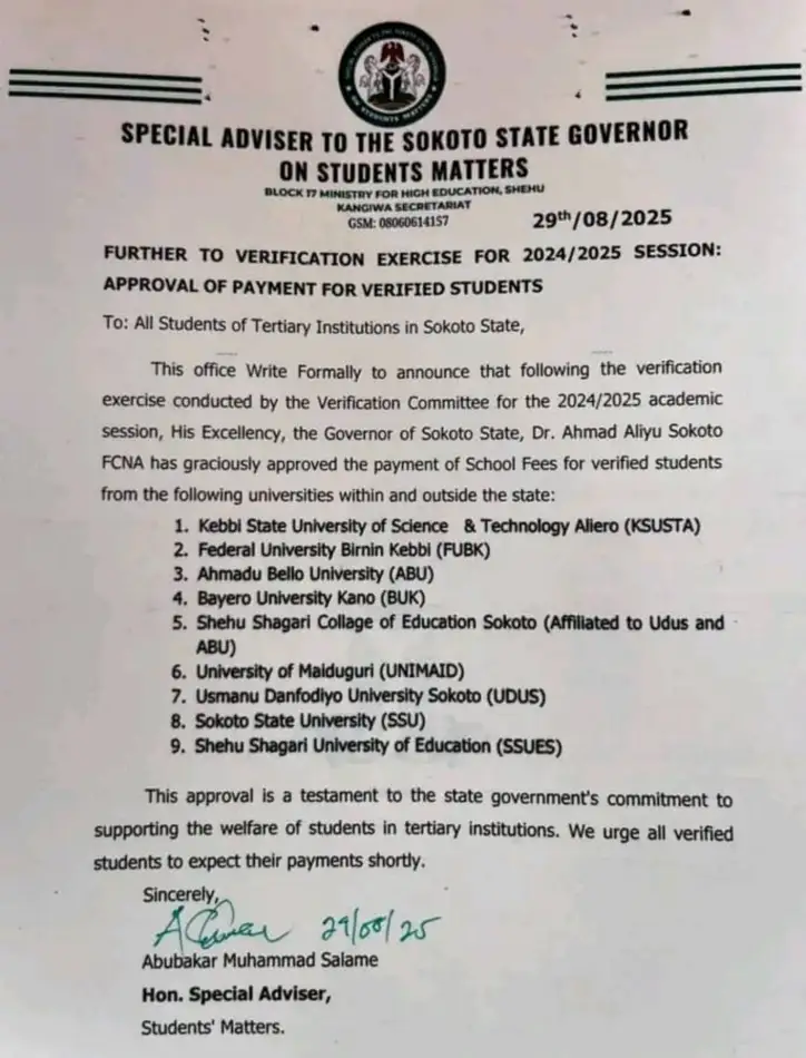 “This office writes formally to announce that following the verification exercise conducted for the 2024/2025 session, His Excellency has graciously approved the payment of school fees for all verified students,” the statement read.