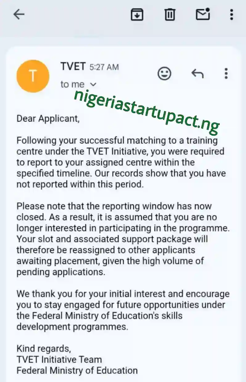 Trainees who receive this email must now wait for new opportunities under the Federal Ministry of Education’s skills development programmes in the future and will no longer be considered for the ongoing TVET programme. This update affects applicants who missed the reporting deadline after being matched to a training centre.