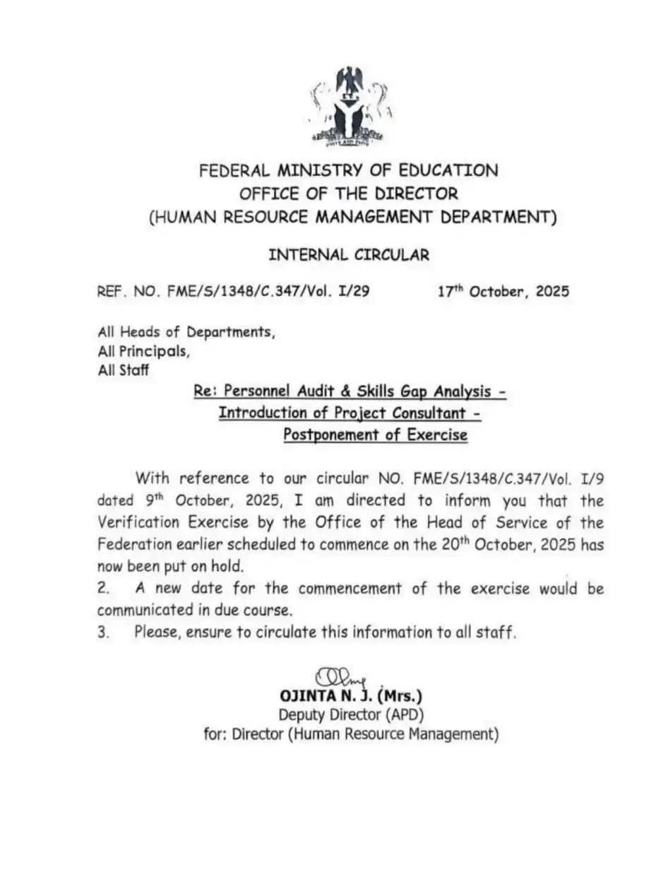 An internal circular circulating on social media claims that the Federal Ministry of Education verification exercise by the Office of the Head of Service of the Federation, earlier scheduled to commence on October 20, 2025, has been put on hold.