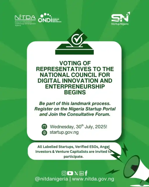 The Federal Government, through NITDA (National Information Technology Developervert Agency) has officially opened voting for four representatives to join the National Council for Digital Innovation and Entrepreneurship (NCDIE). This marks a major step in strengthening Nigeria’s startup and digital economy.
