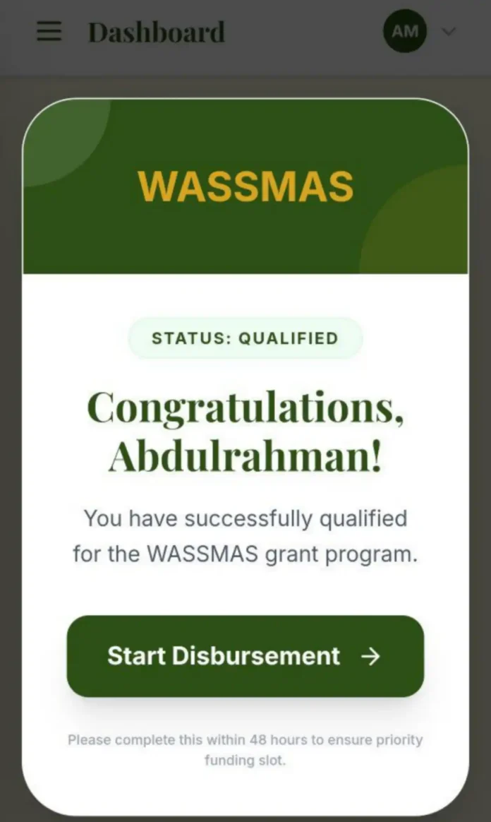 Applicants who are qualified for the WASSMAS grant program are to click on Start Disbursement on their dashboard. Qualified applicants must complete the process within 48 hours to secure priority funding, as funds may be reassigned. Grant disbursement is expected to begin within 24 hours.