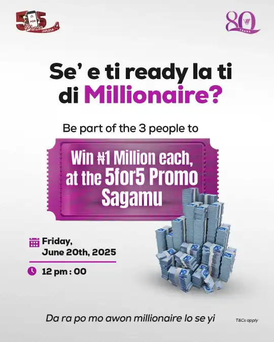 Wema Bank has announced via its official social media handles that “three lucky winners will walk away with N1 Million EACH” during the 5for5 Promo Live event. The millionaire giveaway is set to take place in Sagamu on Friday, June 20th, 2025, at 12:00 PM.