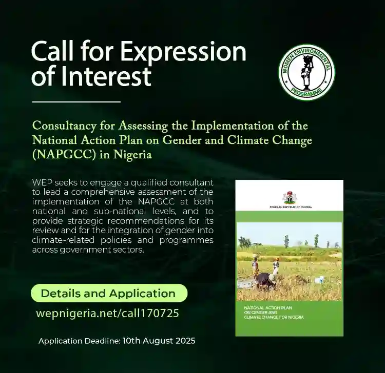 Women Environmental Programme (WEP) has announced an extension of the deadline for its call for expression of interest in a consultancy role to assess the implementation of the National Action Plan on Gender and Climate Change (NAPGCC) in Nigeria.