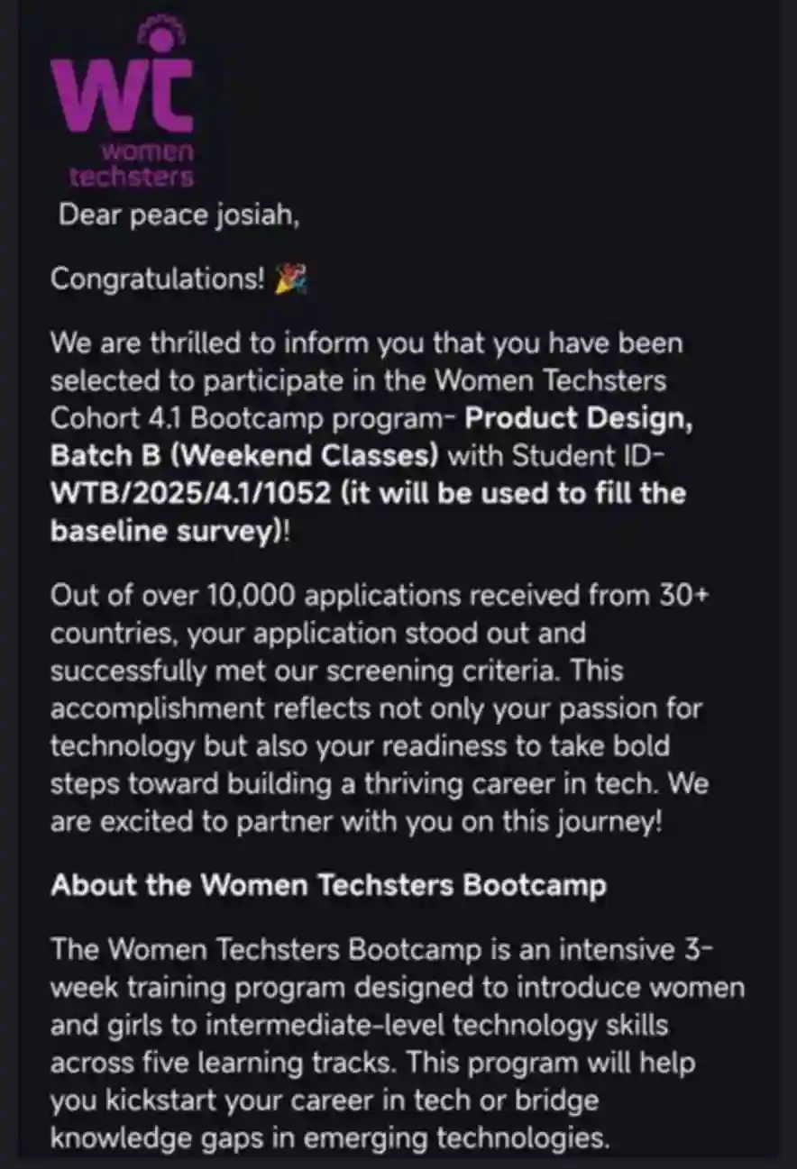 Women Techsters has started sending congratulatory emails to successful candidates selected for the Women Techsters Cohort 4.1 Bootcamp program. Applicants are advised to check their inboxes to know their application status.