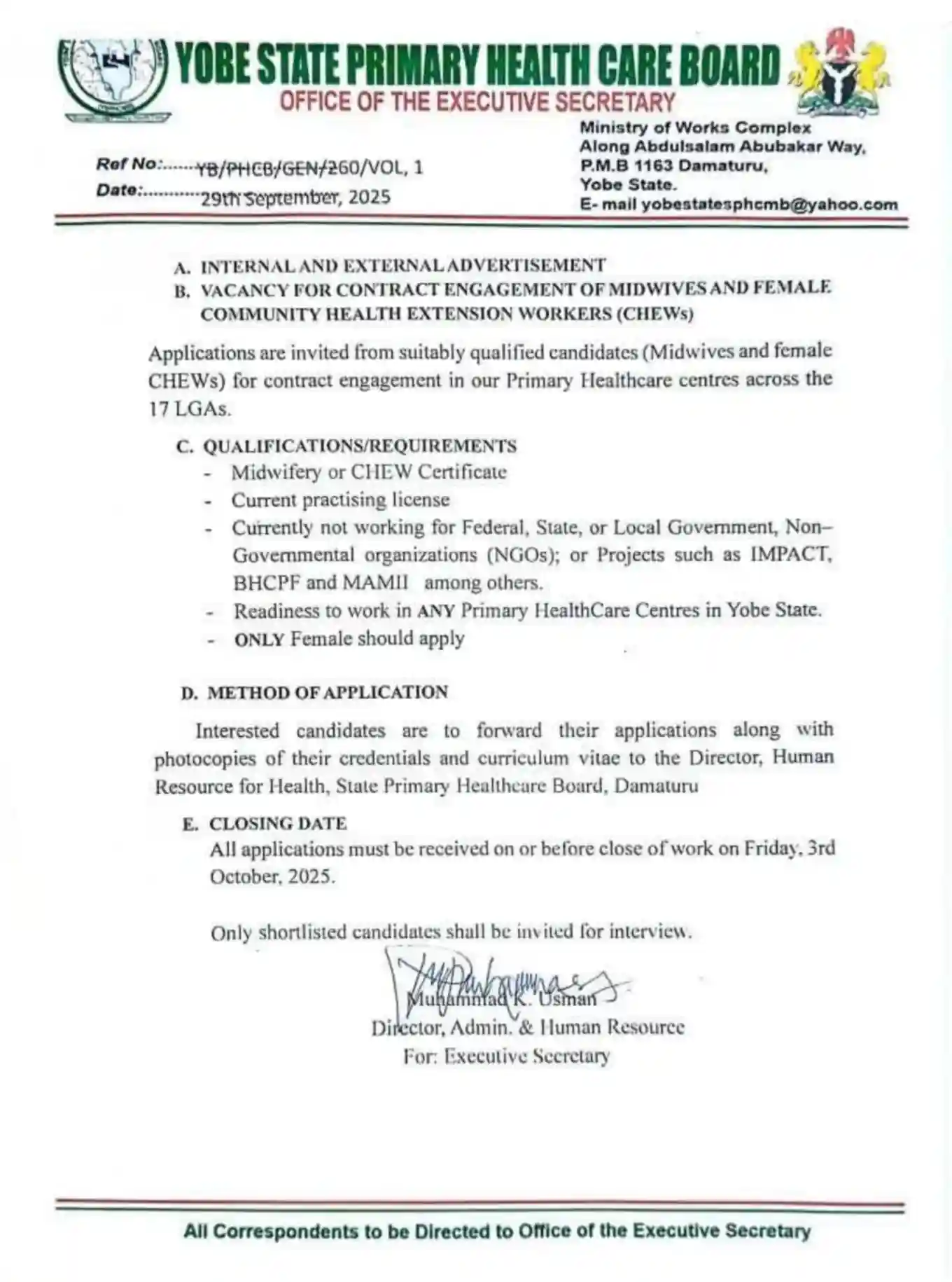 The qualifications required include a Midwifery or CHEW certificate and a current practising license. The board stressed that applicants must not be working with Federal, State, or Local Government institutions, Non-Governmental Organizations, or projects such as IMPACT, BHCPF, and MAMII. Another requirement is readiness to work in any primary healthcare centre within Yobe State. The notice also made it clear that only female candidates are eligible.