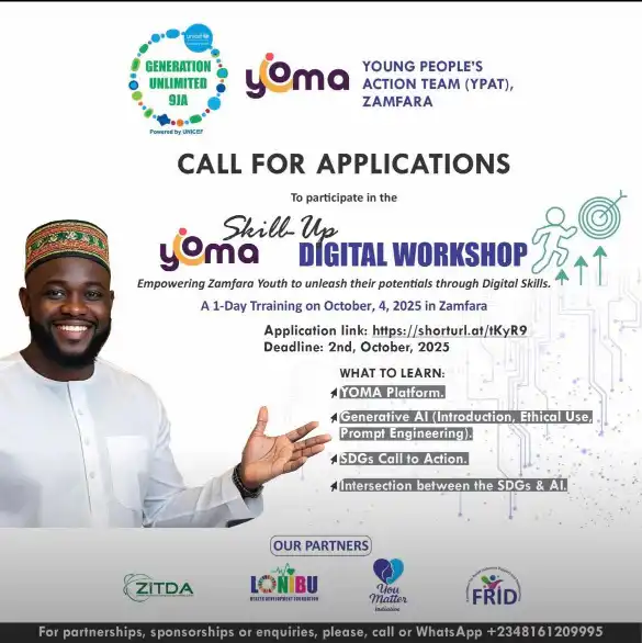 Call for applications has been announced for the YOMA Skill-Up Digital Workshop taking place in Zamfara. The one-day training is scheduled for October 4, 2025, and is designed to empower Zamfara youths with practical digital skills.
